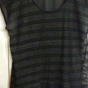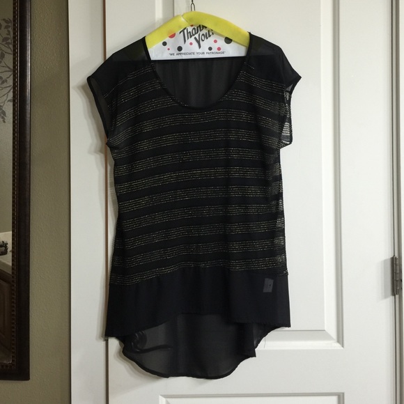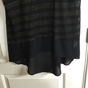 Black sheet material with metallic gold stripes on the front. High-low style.. New condition, worn only once.