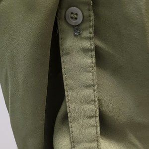 Ruiyize, sheer olive green, longer length in back than front, 3/4 sleeve with buttons on side, 1/3 button placard on front. Picture of sleeve is closer to actual color of blouse.