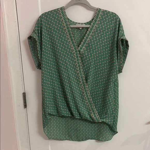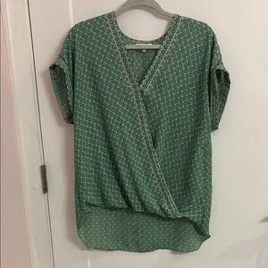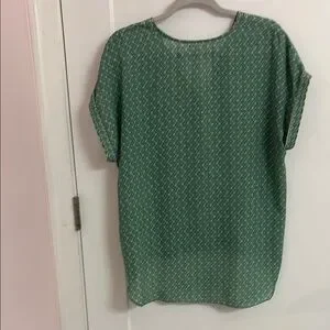 Lightweight top appears tucked in when looking from the front, but drapes nicely in back. New without tags. Perfect with jeans.