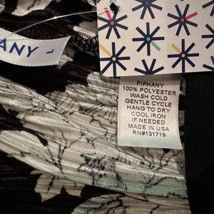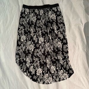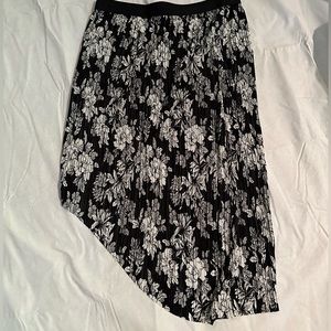 Black and white floral print pull on, elastic waist skirt long in the back and shorter in the front. Clean in smoke free home.