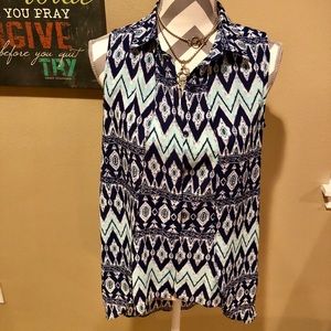 Great navy and aqua patterned button up, with collar, high-low blouse with layered front panel.