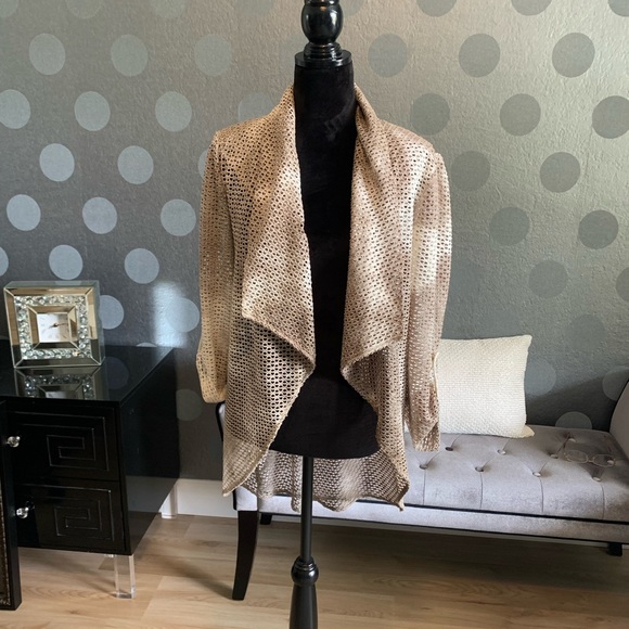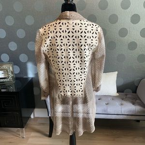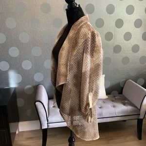 Unique cream and taupe colored high/low topper. Tabbed sleeves and unique back. Make a statement when you wear it with a sleeveless top and jeans. 😍