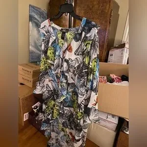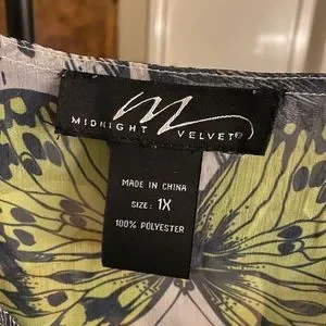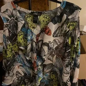 Floral butterfly tunic, ruffle sleeves, high, low pretty to wear with leggings. Dresses up an outfit we believe.