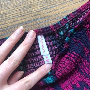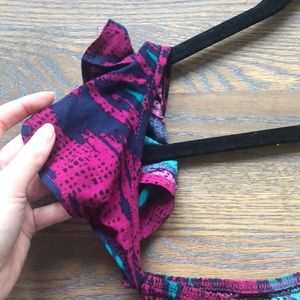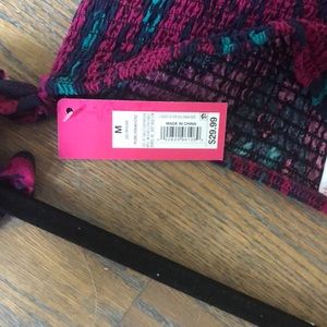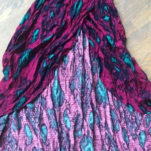 This is a casual light weight multi colored high-low dress (from Target) the colors (if pictures don’t show perfectly) are a maroon a very dark navy blue and teal the straps have a little ruffle to them