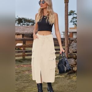 High-Rise Midi Retro 90s Cargo Pocket Elastic Waist Khaki Denim Jean Slit Skirt