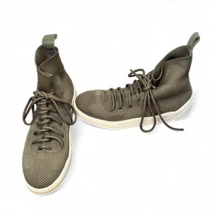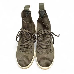 Step up your style with these olive green high-top knit sneakers. Perfect for casual outings, these shoes offer comfort and a modern look.