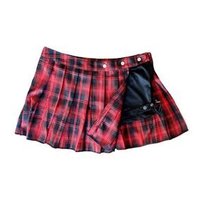 High Waist Red Plaid Pleated Mini Skirt Leg Strap - NEW
