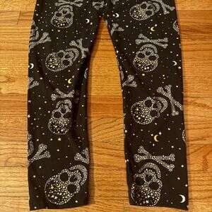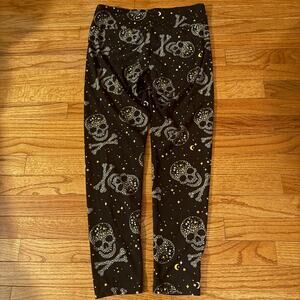 Black full-length leggings featuring a celestial skull-and-crossbones print. The design is detailed with tiny white and gold dots forming skulls, stars, and crescent moons across the fabric for a cosmic, slightly edgy vibe. Made with soft, stretchy material and a wide elastic waistband for a comfy fit.