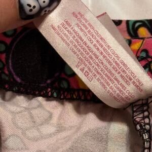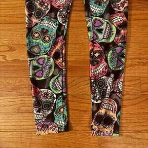 Vibrant and fun full-length leggings featuring a bold sugar skull pattern inspired by Día de los Muertos. The print includes bright shades of turquoise, pink, purple, yellow, and white set against a black background. Made with a soft, stretchy material and an elastic waistband for a comfortable, body-hugging fit.