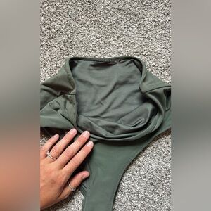 Stylish high-waisted bikini bottom in olive green. Perfect for a chic beach look.
