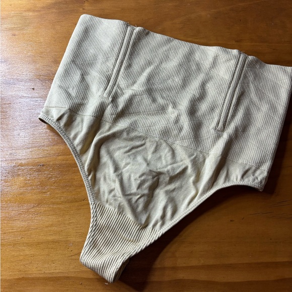 High-waisted ribbed shapewear in a neutral tan color. Provides a smooth silhouette.