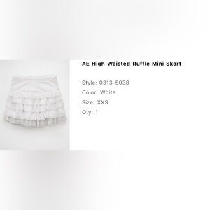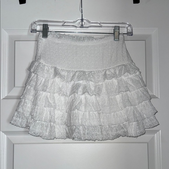 White mini skirt with lace ruffles and built-in shorts underneath. Never worn but tags have been removed.