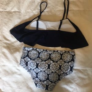 Adorable and comfortable! Enjoy the beach this summer in style and ease. High-Waisted, full coverage bottoms. Ruffle top, pads included. Top is Navy blue, bottoms are Navy with design in white.