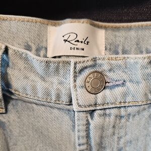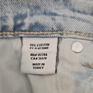 Light blue denim with classic five pockets 2 side cargo pockets - three upper front pockets, logo embossed buttons, zip - up, button fly, belt loops, mid - length, straight hem skirt. Ideal for everyday wear.