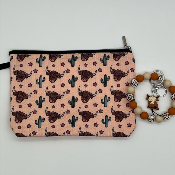 Stylish cosmetics pouch with cactus and highland cow print. Perfect for organizing essentials. Includes beaded highland cow bag charm key charm.