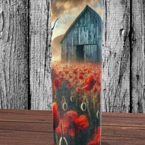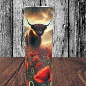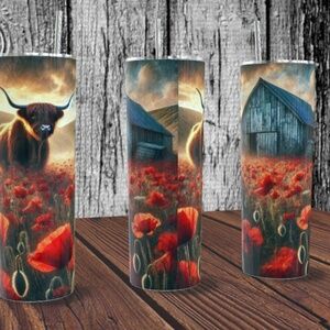 Highland Cow with Barn and Red Flowers 20 oz Skinny Tumbler