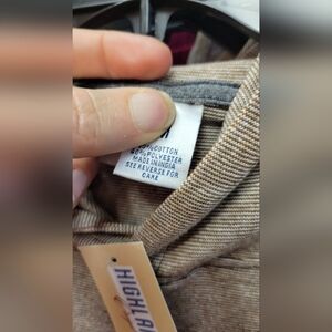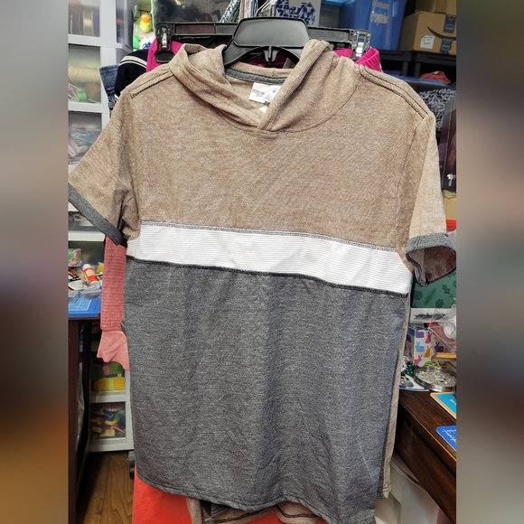 Three-tone short sleeve hoodie. Features a tan and gray color block design with a white stripe accent.