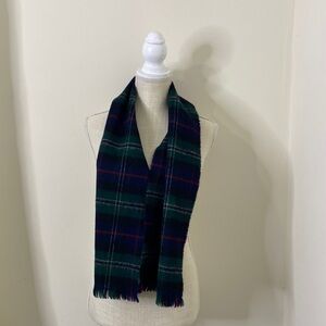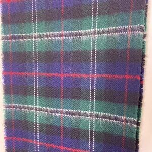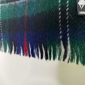 Highlander by Lochcarron 100% new wool plaid scarf. Blue, green, red, black and white. Small fringe. Made in Scotland