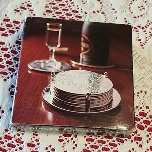 6 coasters and 1 storage caddy that can be used for a bottle coaster as well