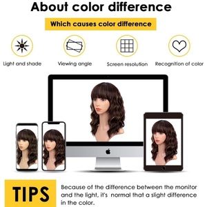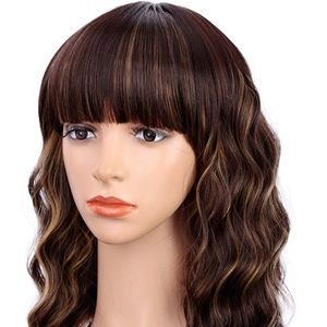 ❌Dark Brown Wigs with Bangs Wavy Bob Wig Brown Highlighted Wigs ❌ Wig Cap】 Average cap size circumference 22.5 inches with 2 adjustable straps inside the cap. ❌ 14 Inch brown mixed honey blonde highlight ❌ The bang wig is made of high quality heat resistant synthetic fiber which is very soft and silky,Can be Straight & Curled ❌ perfect for Halloween, concerts, theme parties, weddings, dating, and daily use.