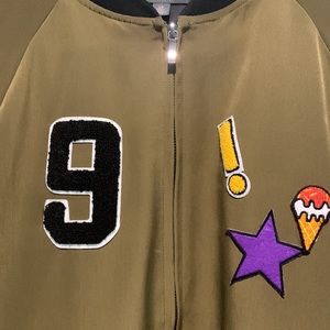 Super cute and fun bomber jacket with colorful patch details on front and sleeves.