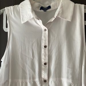 High/low white button down sleeveless blouse with Foley ruffled hem