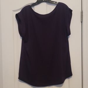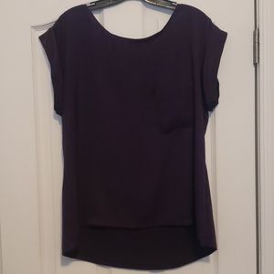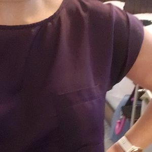 Deep purple top that can be dressed up or down. Shorter in front than in back. Silky front and cotton back. Cuffed sleeves and pocket over left side.