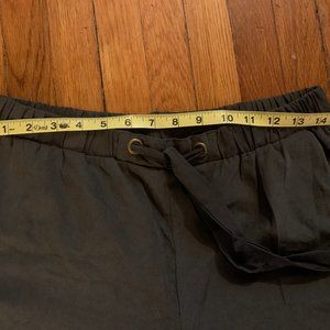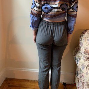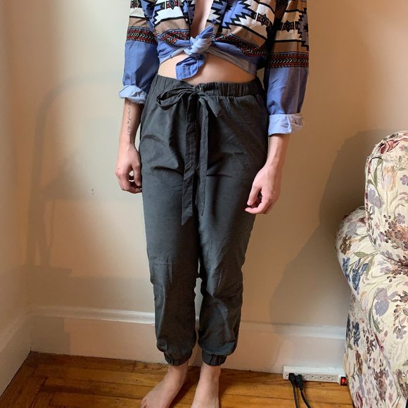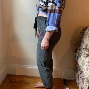 High-waisted tie waist Easel LA satin-y gray joggers.