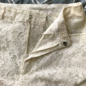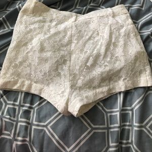 These are high waisted white/cream lace shorts. They are a size 6 on the brand however they fit a size 4/5. They have lining so it is not see through however, undergarments will be noticeable if they are a dark/neon color so just keep that in mind. Nude/white undergarments are best with these. They are not an itchy material. Worn only a couple times, in good condition.