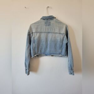 Super cute cropped length denim jean jacket in a light wash with button closure and full length sleeves. Great condition. Size small measures approximately 17 inches long 19 inches underarm to underarm laid flat.