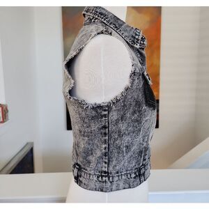 Stylish denim vest with button closure. Features dual chest pockets. Frayed armholes for a trendy look.