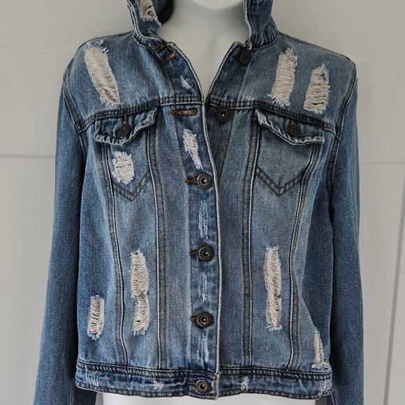 This is a Highway denim jacket with distressed shredded areas. Sz. Small but I think it's a Junior size small because it's really small.