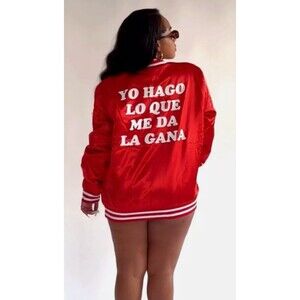 Hija De Tu Madre Red Cherry Logo Satin Bad Bunny "Yo Hago Lo Que Me Da La Gana" ("I Do What I Want") Lyrics Bomber Jacket.