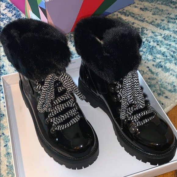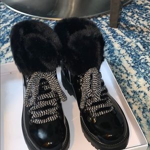 Gorgeous cold weather black patent hiking boots. Faux fur lining and black rubber sole. Boots have lace up closure with soft velvet-like, black and white laces. Brand new in box.