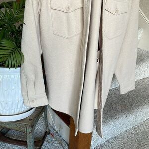 Elegant beige outerwear by Hilary Radley. Features a classic design, button down front, chest pockets, and soft textured material. perfect for layering this fall. Amazing pre loved condition size medium