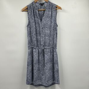 Hilary Radley Blue Leopard Print Sleeveless Dress Drawstring Waist 2. Fully lined, 100% polyester. Front button up hidden placket. Gently used condition with no visible flaws.