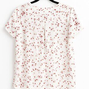 Pretty Hilary Radley short sleeve blouse in a soft cream base with an allover delicate floral print in shades of burgundy, blush, and black. Designed with a flattering split neckline and a relaxed, easy silhouette that drapes smoothly without clinging.