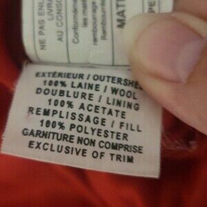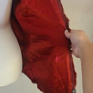 Zips up in front with faux fur in front and on hood. Wool on outside and arms (very warm). Light stretch to it. Size 2, but after some research, I believe this is a large (please go by measurements). There was a repair to lining inside underarm seen in pictures #11 & 12 (hand-sewn not the perfect stitch) and may fit slightly snugger on that arm due to the repair. Approximate measurements in the last 2 photos (pit to pit and length). Make me an offer. (Feels like rabbit fur, but nothing on tag indicates it is).