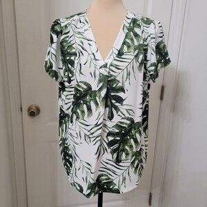 Hilary Radley Size L White with Green Palm Leaf Pattern V Neck Blouse