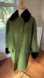 Gorgeous moss green wool blend Hilary Radley Pea Coat. Gorgeous gray wool removable liner with chocolate brown faux fur collar and wrist detail. Made in Canada, incredible craftsmanship in the quality of the button in removable liner and super soft brown fur detailing. Front patch flapped pockets.