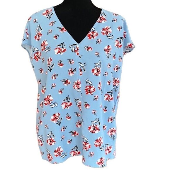 Hilary Radley blue floral v neck cap sleeved relaxed fit top size M. Polyester and spandex blend. Approximate measurements are pit to pit 20”, length from shoulder approximately 24”.