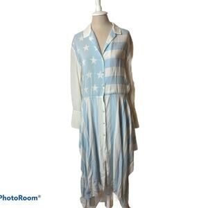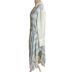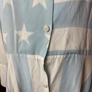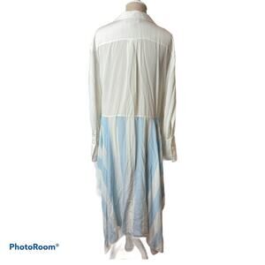 It is in good used condition. Missing some buttons, one button on each sleeve cuff & 2 buttons on the front closure. There is one extra button sewn to the label. See images. Approximate measurements: Pit to pit 19.5", waist one side flat 17.5", shoulder to hemline 44". Sheer dress could be worn as a dress with a slip or as a cover-up to the beach.