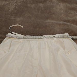 White pants are in excellent pre-owned condition. Slightly off color smudging on the cuff of the pant on one leg as seen in last photo.