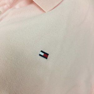 DESCRIPTION: Long sleeve pink top. Has 5 buttons on front and the Tommy Hilfiger emblem. Has a slit on each side at hemline.