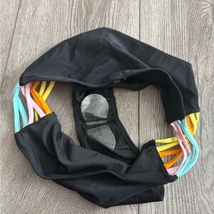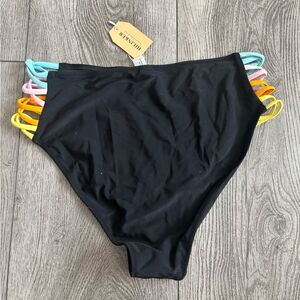 Stylish and comfortable, this bikini bottom features a sleek black design with vibrant multi-color straps. Perfect for a day at the beach or pool.