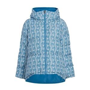 Stylish blue puffer jacket. Features intricate pattern. Warm and cozy design. Perfect for cold weather.