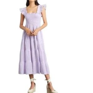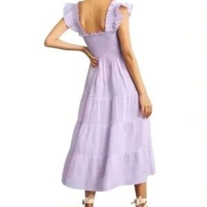 The Ellie is an A-line Nap Dress® with proprietary, elasticated Nap Smocking, ruffled shoulders, tiered midi skirt, and pockets.