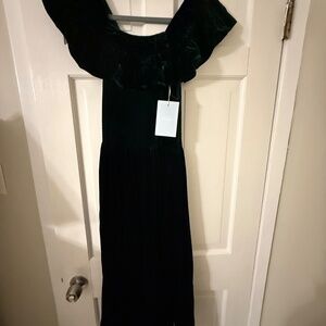 Elegant green velvet midi dress. Features a ruffled neckline. Perfect for any occasion.