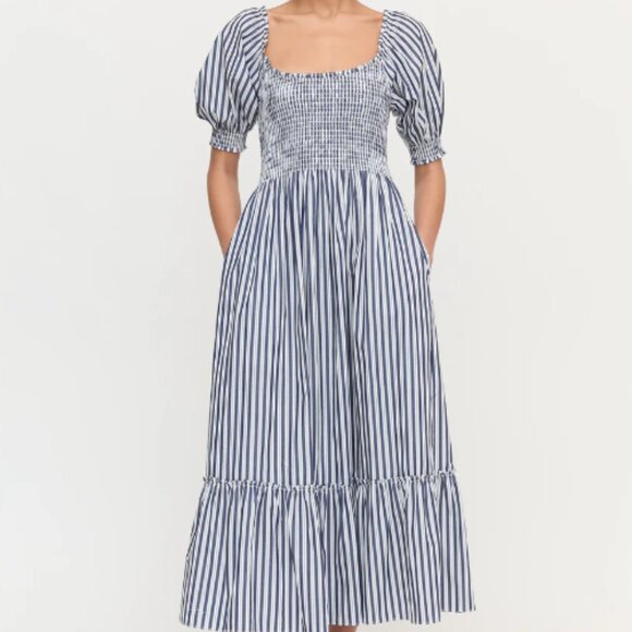 Elasticated Nap Smocking, a bra-friendly scooped neckline, ruffle hem midi skirt in an updated length and puff sleeves.