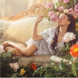 Hill House wrap dress with floral pattern. Features ruffle accents and short sleeves. Mini Nima dress, wrap dress, ruffles, tie waist, 100% silk, size L. Good pre-owned condition